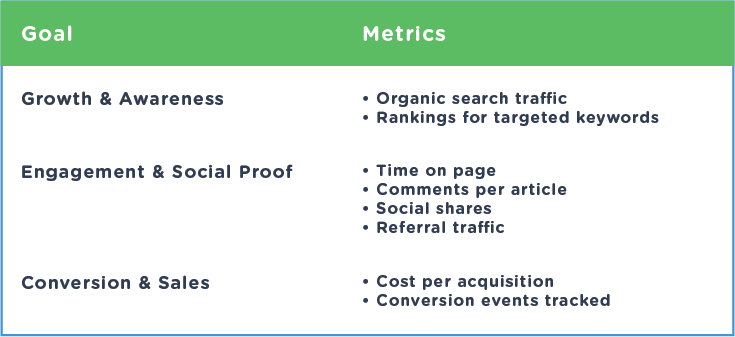 Add a new tab in your metrics tracking spreadsheet, or create a new spreadsheet altogether, to track the individual performance of your blog posts across the metrics that correlate with your goal. It should look something like this template, using only the relevant columns.