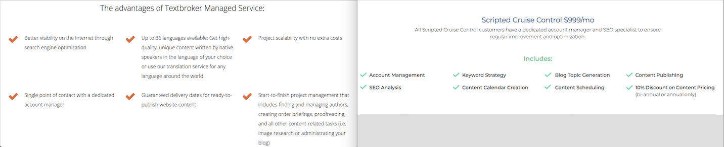 Textbroker offers a Managed Service Membership that is comparable to Scripted's Cruise Control Membership that promises full-service content. You can see below the listed features for each program and the glaring difference, other than the $2500 vs. $999 starting prices, is that Scripted offers a keyword strategy and SEO analysis with Cruise Control.
